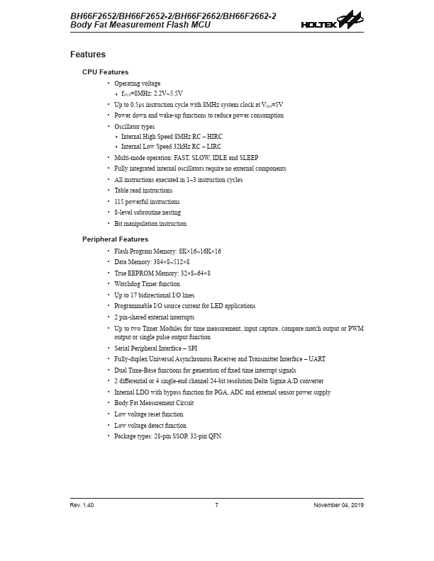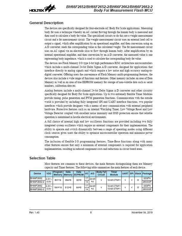 - Operating voltage -- fSYS=8MHz: 2.2V~5.5V
