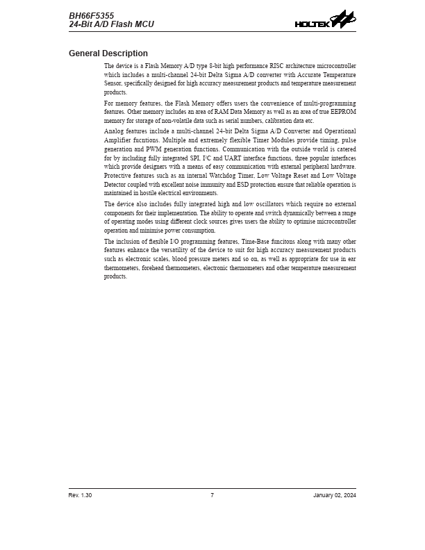 The device is a Flash Memory A/D type 8-bit high performance RISC architecture microcontroller which includes a multi-channel 24-bit Delta Sigma A/D converter with Accurate Temperature Sensor, specifically designed for high accuracy measurement products and temperature measurement products.