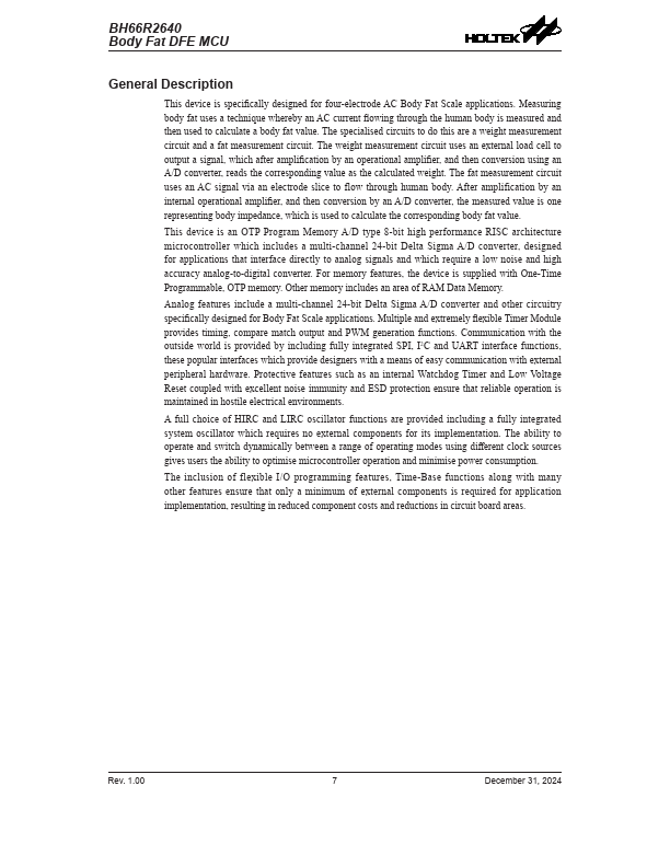 This device is specifically designed for four-electrode AC Body Fat Scale applications. Measuring body fat uses a technique whereby an AC current flowing through the human body is measured and then used to calculate a body fat value. The specialised circuits to do this are a weight measurement circuit and a fat measurement circuit.