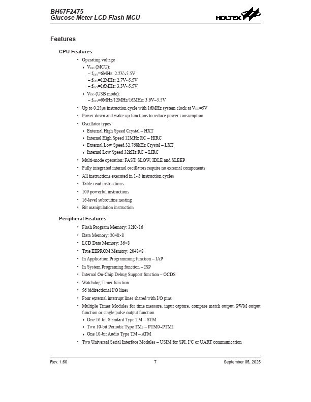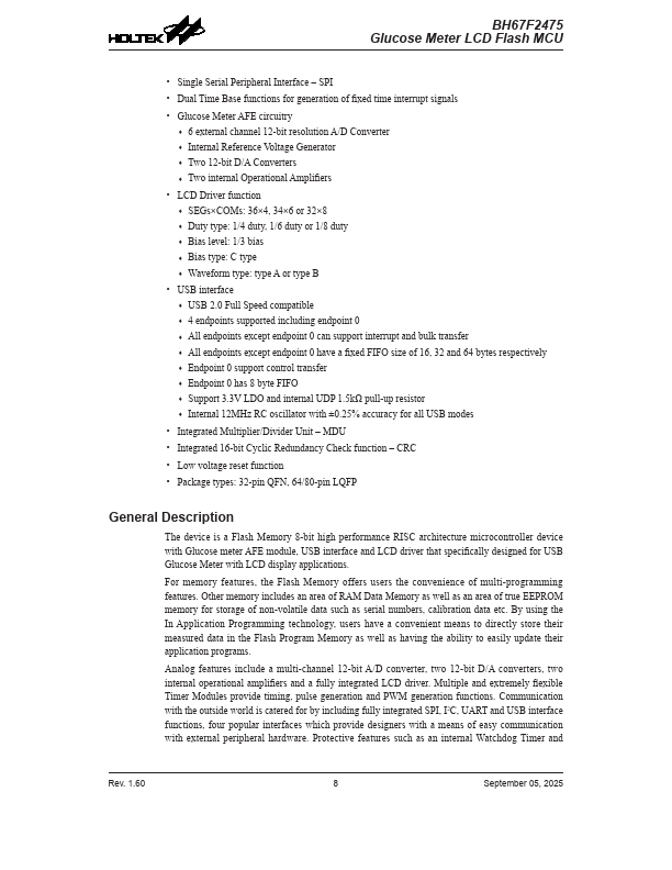The device is a Flash Memory 8-bit high performance RISC architecture microcontroller device with Glucose meter AFE module, USB interface and LCD driver that specifically designed for USB Glucose Meter with LCD.