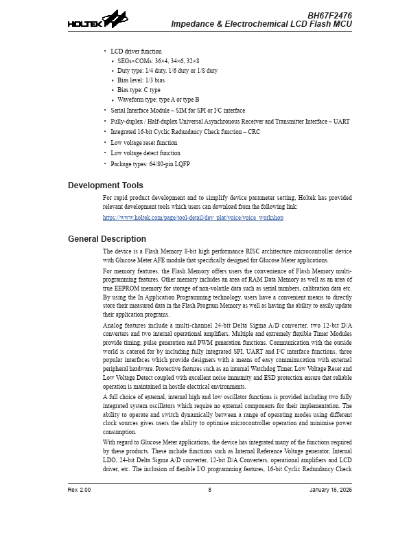 The device is a Flash Memory 8-bit high performance RISC architecture microcontroller device with Glucose Meter AFE module that specifically designed for Glucose Meter applications.