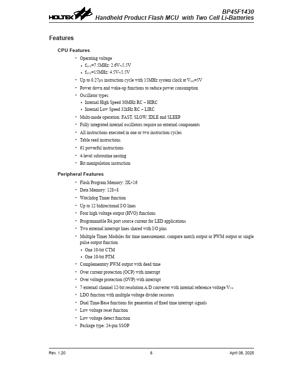 BP45F1430 Key Features