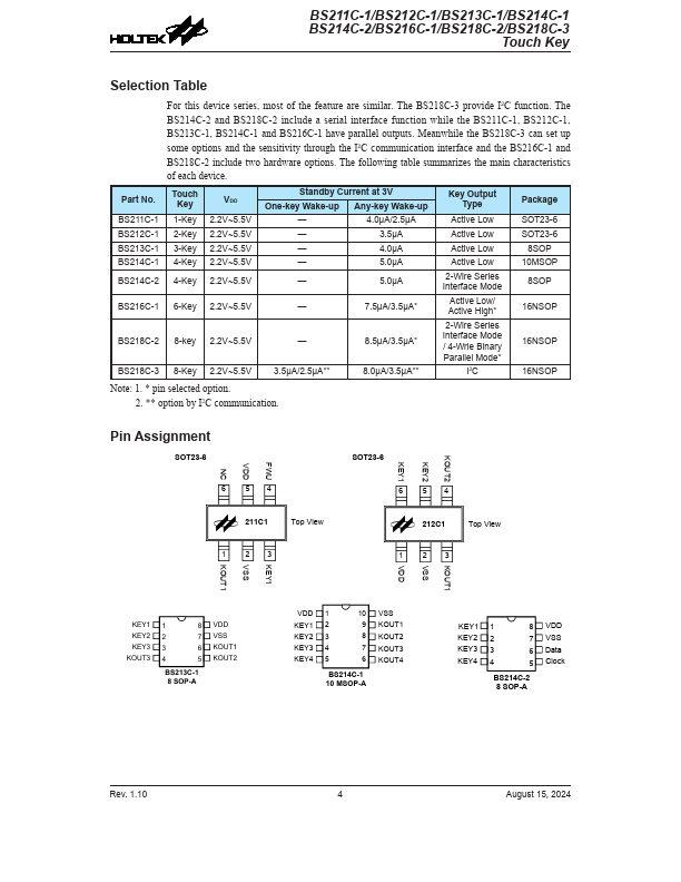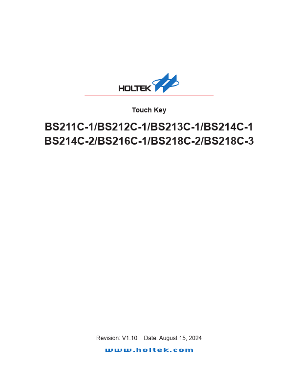 The BS21x is a series of 1~8 key touch key devices which can detect human body contact using external touch pads. The high level of device integration enable applications to be implemented with a minimum number of external ponents. The BS21x series devices are equipped with serial or parallel interfaces to allow easy munication with an external MCU for device setup and for touch pin monitoring purposes.