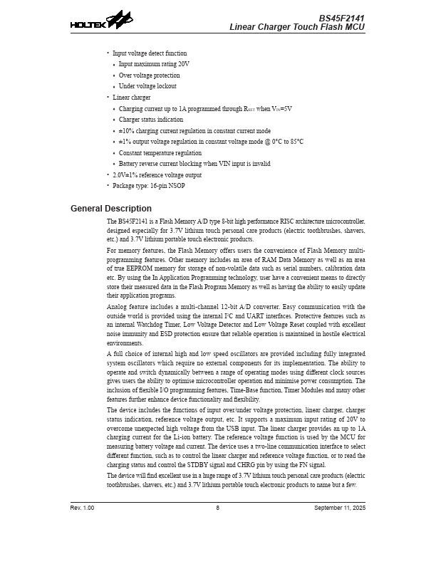 The BS45F2141 is a Flash Memory A/D type 8-bit high performance RISC architecture microcontroller, designed especially for 3.7V lithium touch personal care products (electric toothbrushes, shavers, etc.) and 3.7V lithium portable touch electronic products.