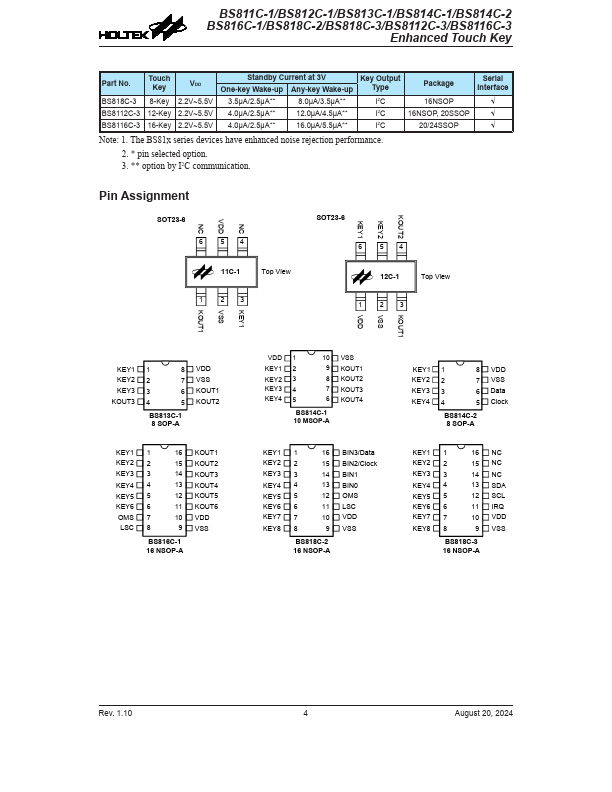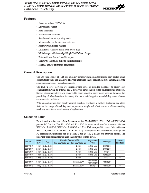 The BS81x is a series of 1~16 key touch key devices which can detect human body contact using external touch pads. The high level of device integration enable applications to be implemented with a minimum number of external ponents. The BS81x series devices are equipped with serial or parallel interfaces to allow easy munication with an external MCU for device setup and for touch pin monitoring purposes.