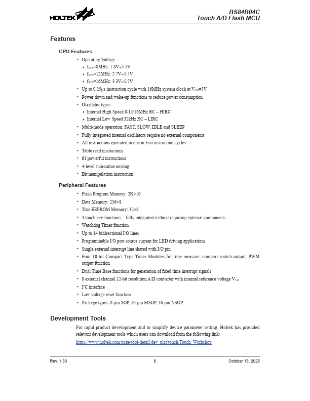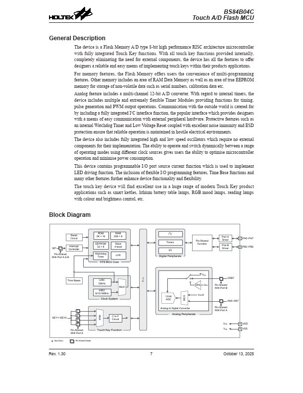 The device is a Flash Memory A/D type 8-bit high performance RISC architecture microcontroller with fully integrated Touch Key functions. With all touch key functions provided internally, pletely eliminating the need for external ponents, the device has all the.
