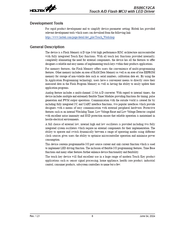 The device is a Flash Memory A/D type 8-bit high performance RISC architecture microcontroller with fully integrated Touch Key functions. With all touch key functions provided internally, pletely eliminating the need for external ponents, the device has all the.
