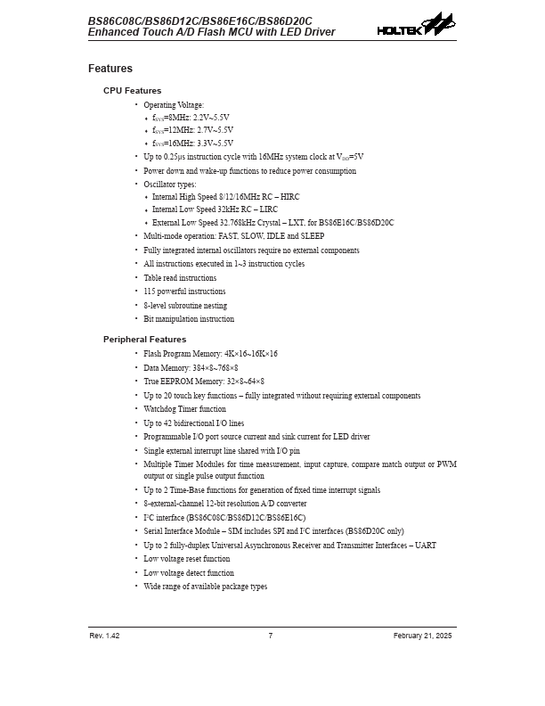 The series of devices are Flash Memory type 8-bit high performance RISC architecture microcontrollers with fully integrated touch key functions. With all touch key functions provided internally and with the convenience of Flash Memory multi-programming.