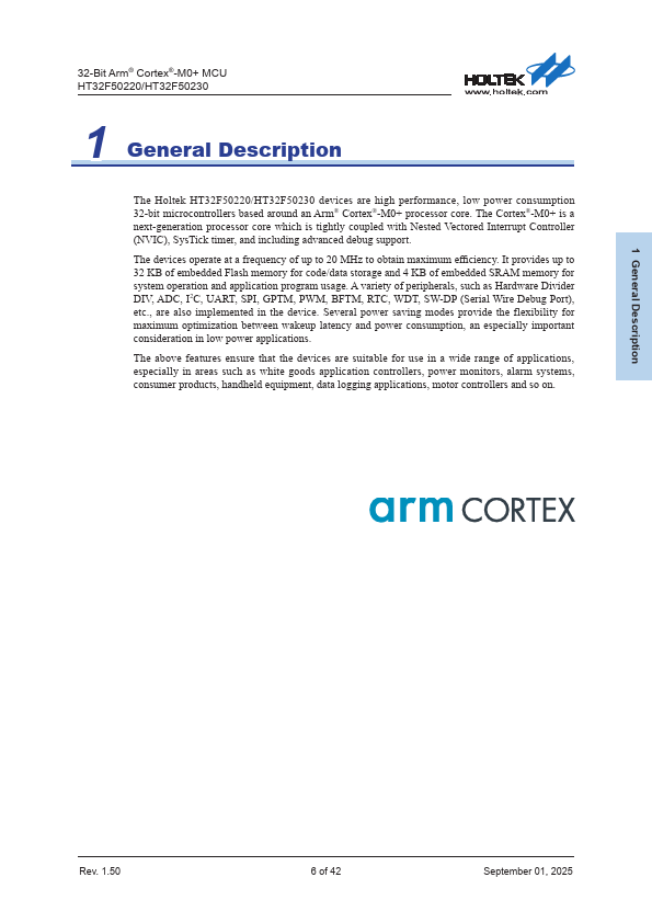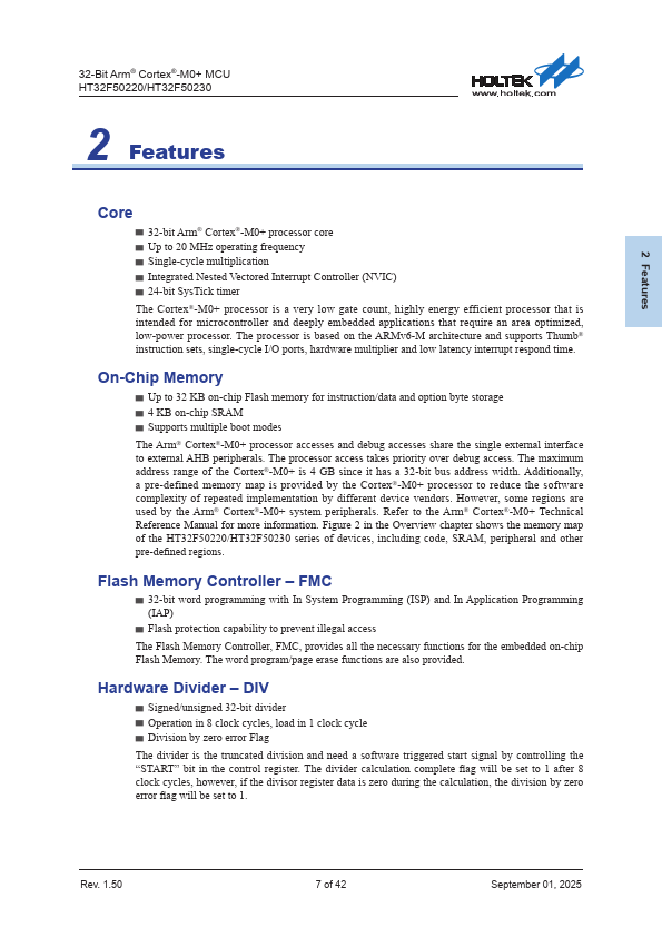 The Holtek HT32F50220/HT32F50230 devices are high performance, low power consumption 32-bit microcontrollers based around an Arm® Cortex®-M0+ processor core. The Cortex®-M0+ is a next-generation processor core which is tightly coupled with Nested Vectored Interrupt Controller (NVIC), SysTick timer, and including advanced debug support. The devices operate at a frequency of up to 20 MHz to obtain maximum efficiency.