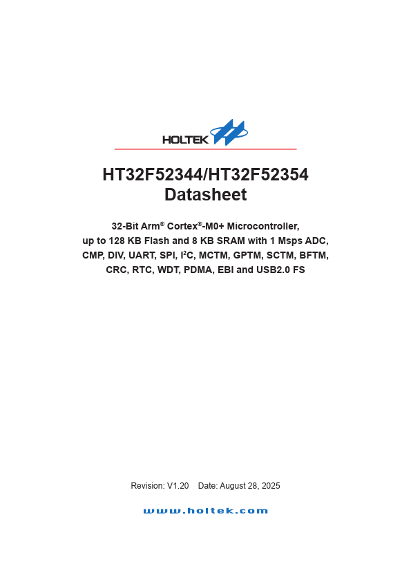 The Holtek HT32F52344/52354 devices are high performance, low power consumption 32-bit microcontrollers based around an Arm® Cortex®-M0+ processor core. The Cortex®-M0+ is a nextgeneration processor core which is tightly coupled with Nested Vectored Interrupt Controller (NVIC), SysTick timer, and including advanced debug support. The devices operate at a frequency of up to 60 MHz with a Flash accelerator to obtain...