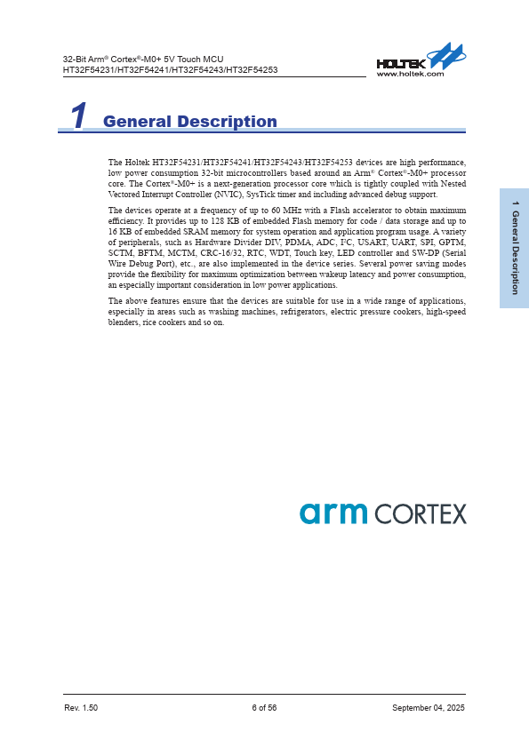The Holtek HT32F54231/HT32F54241/HT32F54243/HT32F54253 devices are high performance, low power consumption 32-bit microcontrollers based around an Arm® Cortex®-M0+ processor core. The Cortex®-M0+ is a next-generation processor core which is tightly coupled with Nested Vectored Interrupt Controller (NVIC), SysTick timer and including advanced debug support. The devices operate at a frequency of up to 60 MHz with a...