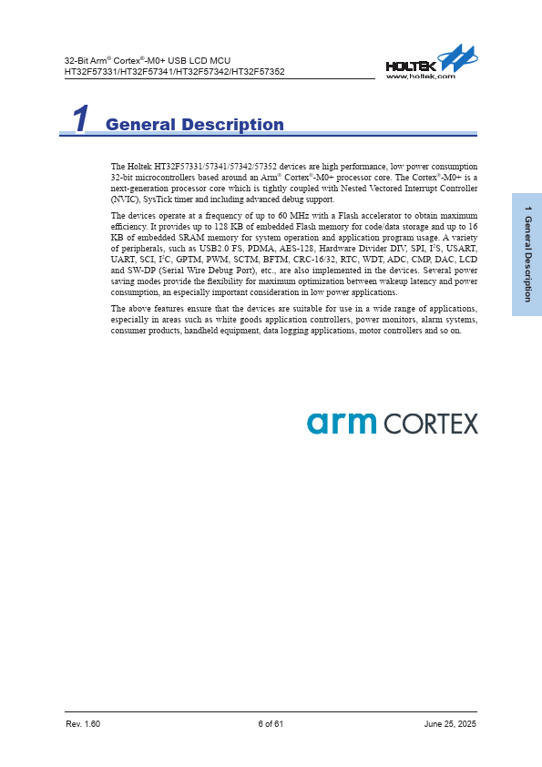 The Holtek HT32F57331/57341/57342/57352 devices are high performance, low power consumption 32-bit microcontrollers based around an Arm® Cortex®-M0+ processor core. The Cortex®-M0+ is a next-generation processor core which is tightly coupled with Nested Vectored Interrupt Controller (NVIC), SysTick timer and including advanced debug support. The devices operate at a frequency of up to 60 MHz with a Flash accelerator...