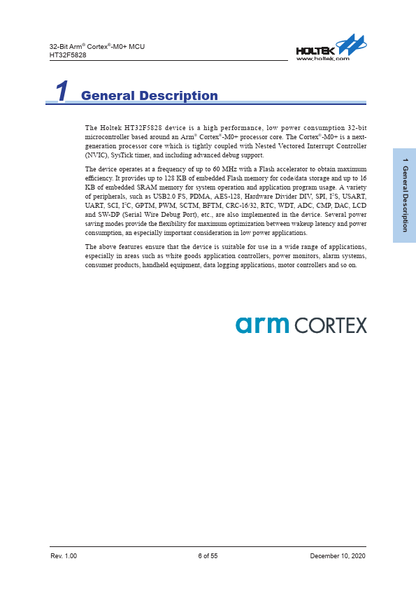 The Holtek HT32F5828 device is a high performance, low power consumption 32-bit microcontroller based around an Arm® Cortex®-M0+ processor core. The Cortex®-M0+ is a nextgeneration processor core which is tightly coupled with Nested Vectored Interrupt Controller (NVIC), SysTick timer, and including advanced debug support. The device operates at a frequency of up to 60 MHz with a Flash accelerator to obtain maximum...