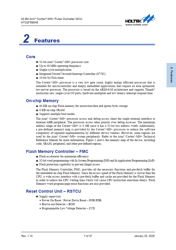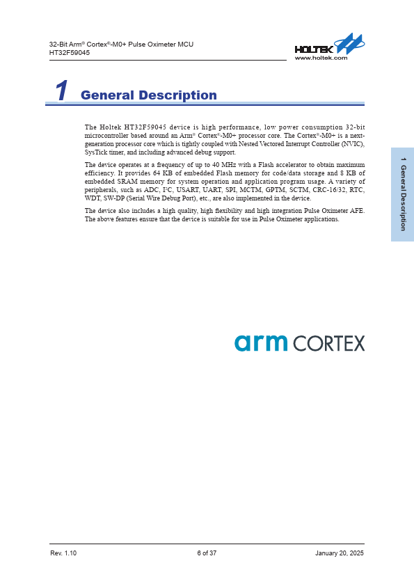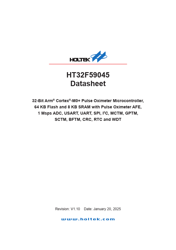 The Holtek HT32F59045 device is high performance, low power consumption 32-bit microcontroller based around an Arm® Cortex®-M0+ processor core. The Cortex®-M0+ is a nextgeneration processor core which is tightly coupled with Nested Vectored Interrupt Controller (NVIC), SysTick timer, and including advanced debug support. The device operates at a frequency of up to 40 MHz with a Flash accelerator to obtain maximum...
