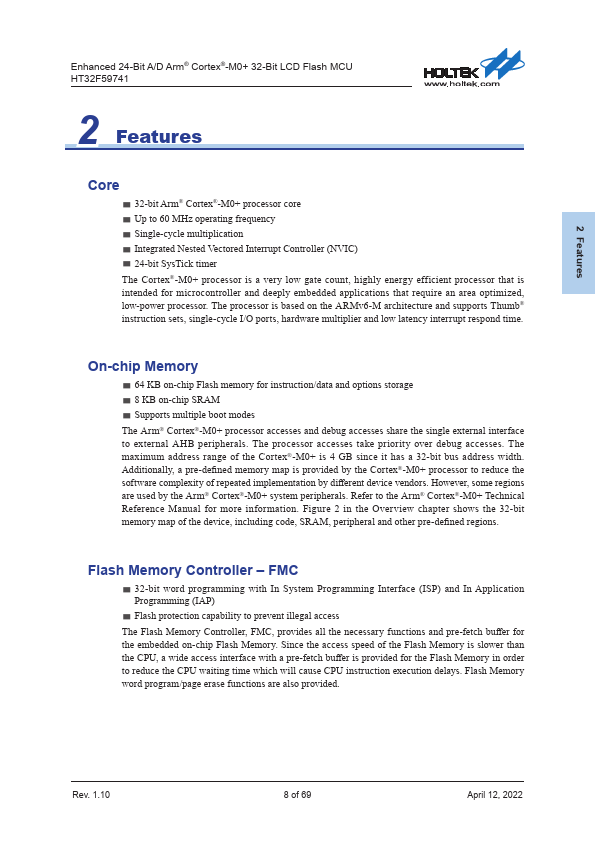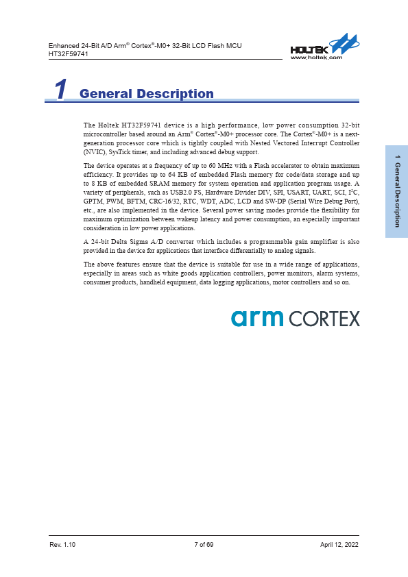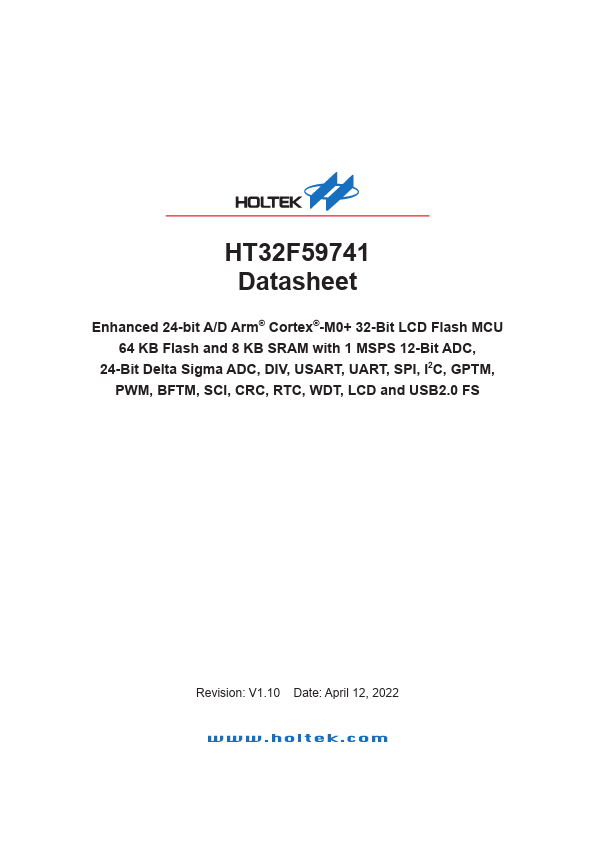 Enhanced 24-Bit A/D Arm® Cortex®-M0+ 32-Bit LCD Flash MCU HT32F59741 1 General Description The Holtek HT32F59741 device is a high performance, low power consumption 32-bit microcontroller based around an Arm® Cortex®-M0+ processor core. The Cortex®-M0+ is a nextgeneration processor core which is tightly coupled with Nested Vectored Interrupt Controller (NVIC), SysTick timer, and including advanced debug support. The...