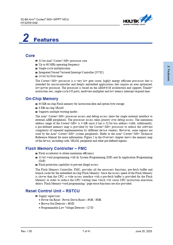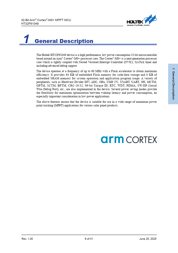 The Holtek HT32F61049 device is a high performance, low power consumption 32-bit microcontroller based around an Arm® Cortex®-M0+ processor core. The Cortex®-M0+ is a next-generation processor core which is tightly coupled with Nested Vectored Interrupt Controller (NVIC), SysTick timer and including advanced debug support. The device operates at a frequency of up to 60 MHz with a Flash accelerator to obtain maximum...