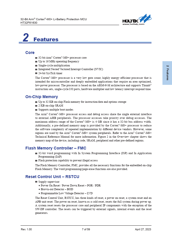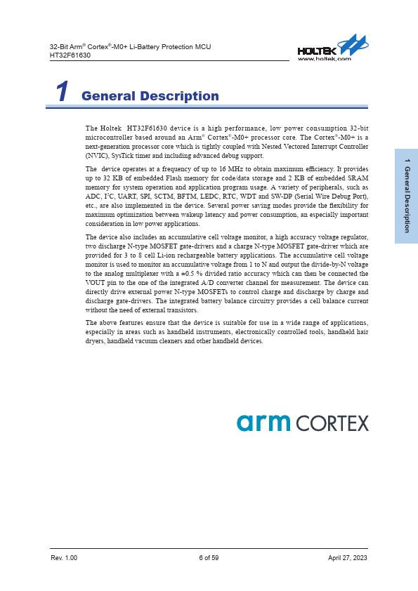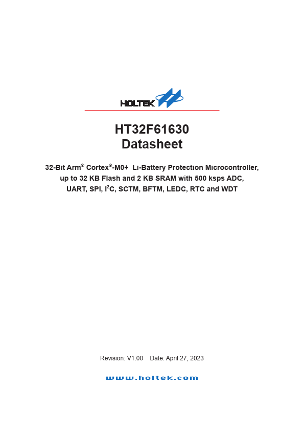 32-Bit Arm® Cortex®-M0+ Li-Battery Protection MCU HT32F61630 1 General Description The Holtek HT32F61630 device is a high performance, low power consumption 32-bit microcontroller based around an Arm® Cortex®-M0+ processor core. The Cortex®-M0+ is a next-generation processor core which is tightly coupled with Nested Vectored Interrupt Controller (NVIC), SysTick timer and including advanced debug support. The device...