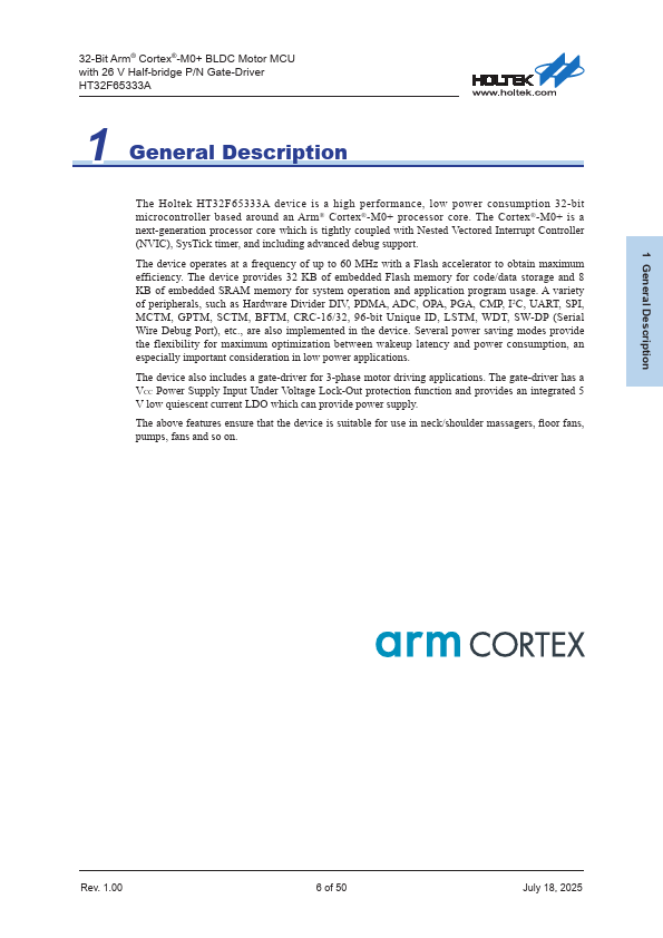The Holtek HT32F65333A device is a high performance, low power consumption 32-bit microcontroller based around an Arm® Cortex®-M0+ processor core. The Cortex®-M0+ is a next-generation processor core which is tightly coupled with Nested Vectored Interrupt Controller (NVIC), SysTick timer, and including advanced debug support. The device operates at a frequency of up to 60 MHz with a Flash accelerator to obtain...