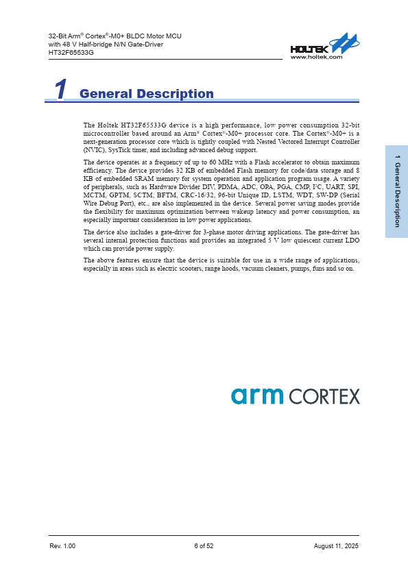 The Holtek HT32F65533G device is a high performance, low power consumption 32-bit microcontroller based around an Arm® Cortex®-M0+ processor core. The Cortex®-M0+ is a next-generation processor core which is tightly coupled with Nested Vectored Interrupt Controller (NVIC), SysTick timer, and including advanced debug support. The device operates at a frequency of up to 60 MHz with a Flash accelerator to obtain...