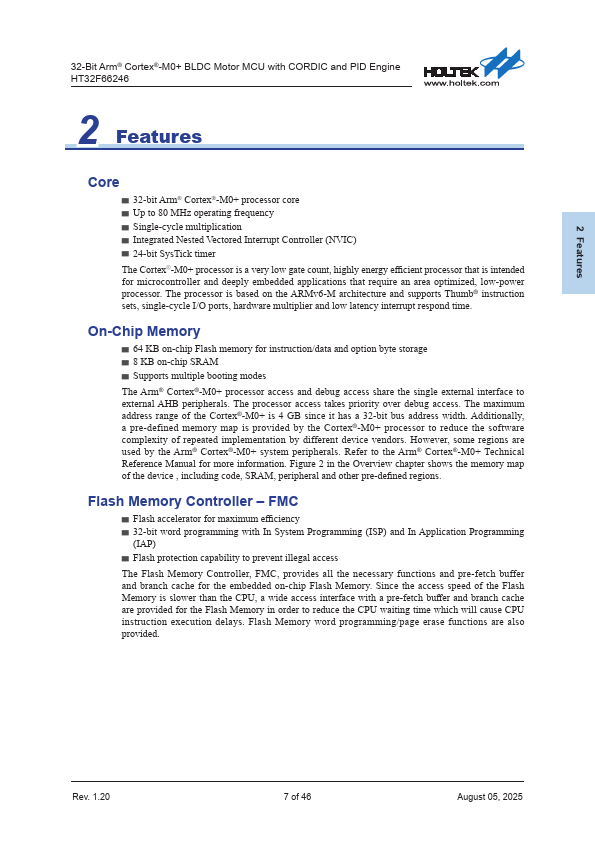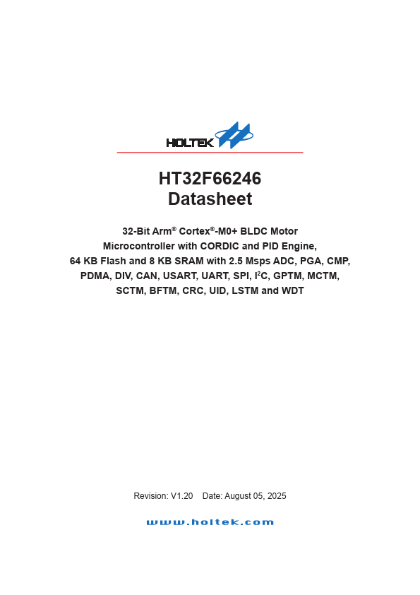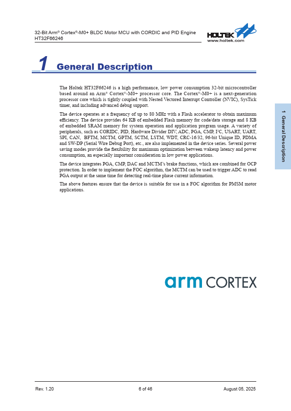 32-Bit Arm® Cortex®-M0+ BLDC Motor MCU with CORDIC and PID Engine HT32F66246 1 General Description The Holtek HT32F66246 is a high performance, low power consumption 32-bit microcontroller based around an Arm® Cortex®-M0+ processor core. The Cortex®-M0+ is a next-generation processor core which is tightly coupled with Nested Vectored Interrupt Controller (NVIC), SysTick timer, and including advanced debug support....