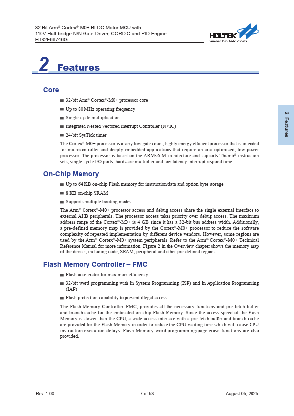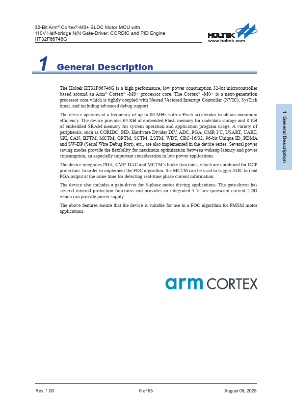 32-Bit Arm® Cortex®-M0+ BLDC Motor MCU with 110V Half-bridge N/N Gate-Driver, CORDIC and PID Engine HT32F66746G 1 General Description The Holtek HT32F66746G is a high performance, low power consumption 32-bit microcontroller based around an Arm® Cortex® -M0+ processor core. The Cortex® -M0+ is a next-generation processor core which is tightly coupled with Nested Vectored Interrupt Controller (NVIC), SysTick timer,...
