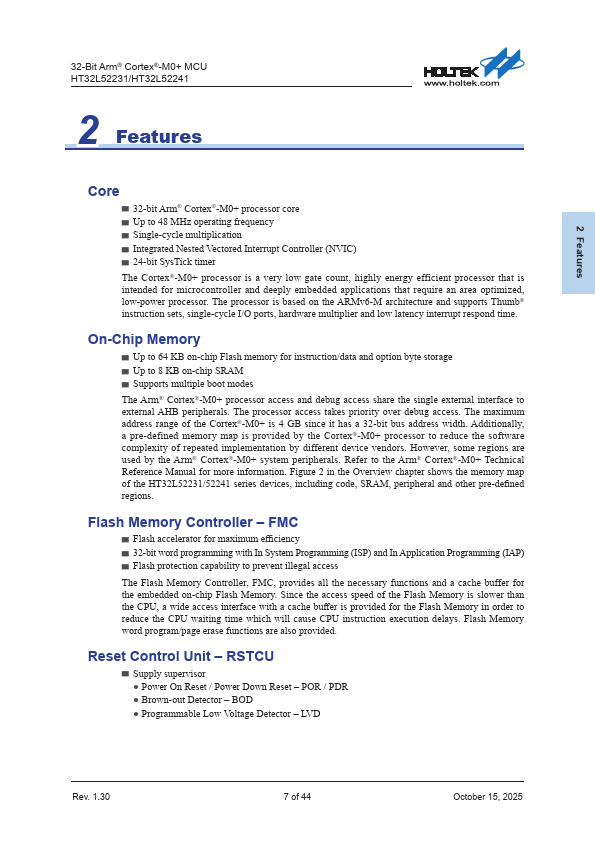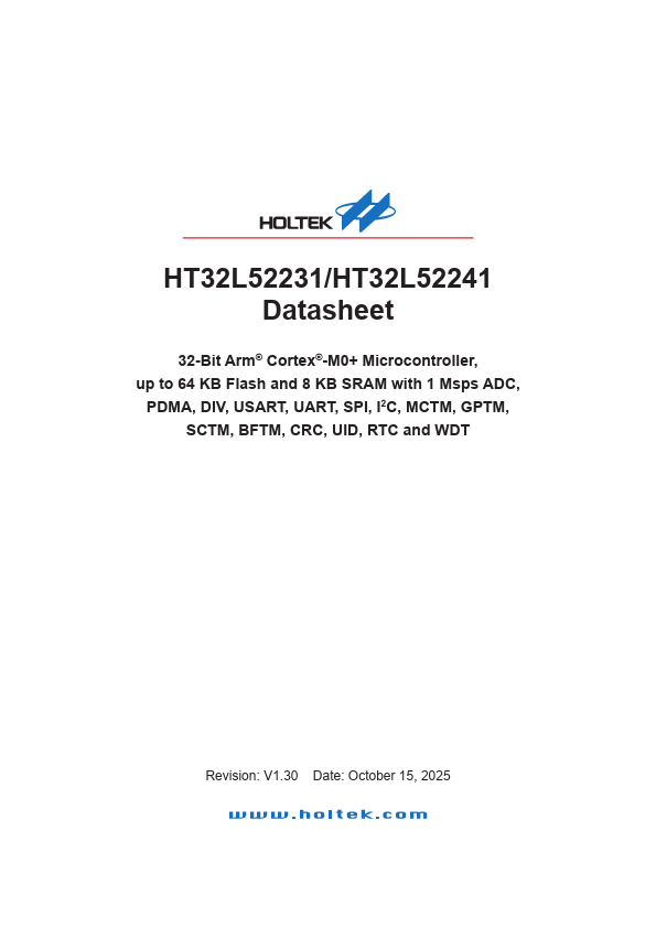 The Holtek HT32L52231/52241 devices are high performance, ultra-low power consumption 32-bit microcontrollers based around an Arm® Cortex®-M0+ processor core. The Cortex®-M0+ is a next-generation processor core which is tightly coupled with Nested Vectored Interrupt Controller (NVIC), SysTick timer and including advanced debug support. The devices operate at a frequency of up to 48 MHz with a Flash accelerator to...