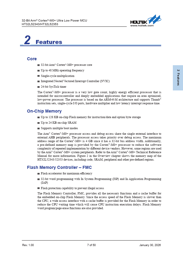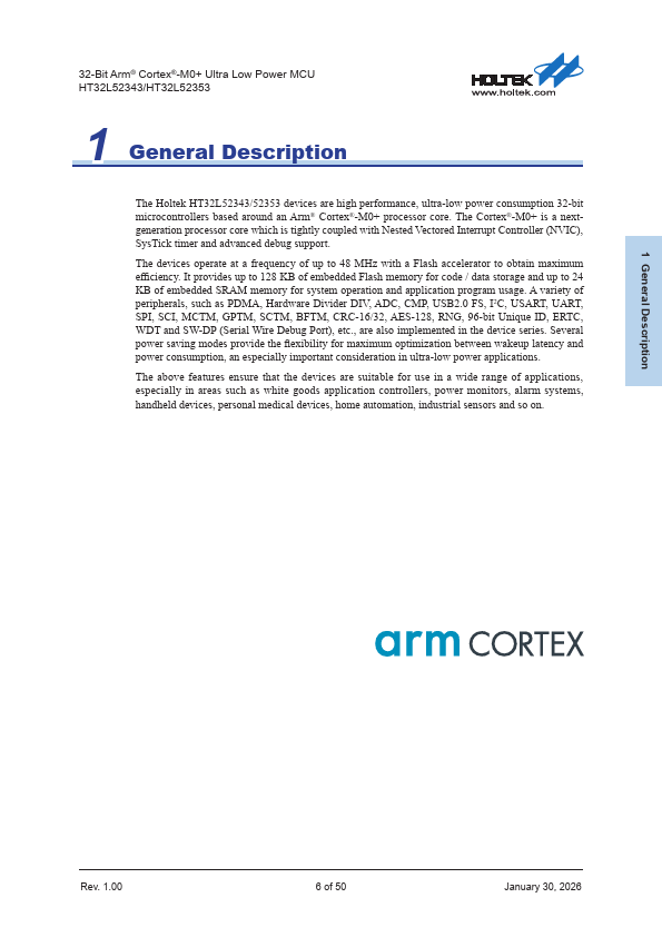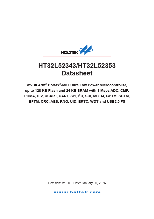 The Holtek HT32L52343/52353 devices are high performance, ultra-low power consumption 32-bit microcontrollers based around an Arm® Cortex®-M0+ processor core. The Cortex®-M0+ is a nextgeneration processor core which is tightly coupled with Nested Vectored Interrupt Controller (NVIC), SysTick timer and advanced debug support. The devices operate at a frequency of up to 48 MHz with a Flash accelerator to obtain...