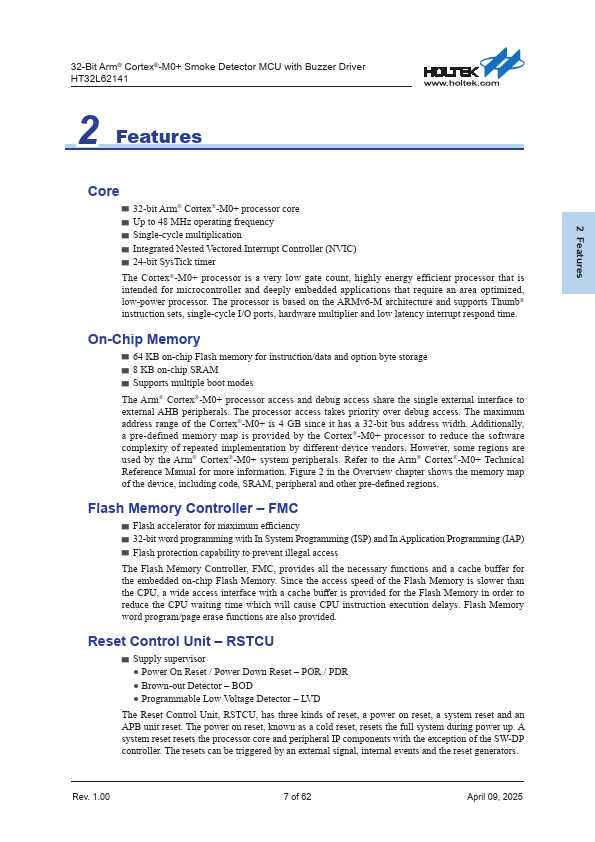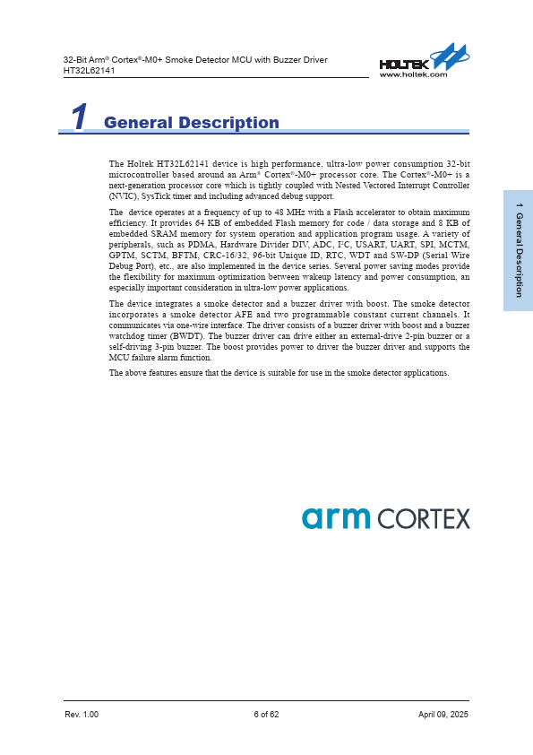 32-Bit Arm® Cortex®-M0+ Smoke Detector MCU with Buzzer Driver HT32L62141 1 General Description The Holtek HT32L62141 device is high performance, ultra-low power consumption 32-bit microcontroller based around an Arm® Cortex®-M0+ processor core. The Cortex®-M0+ is a next-generation processor core which is tightly coupled with Nested Vectored Interrupt Controller (NVIC), SysTick timer and including advanced debug...