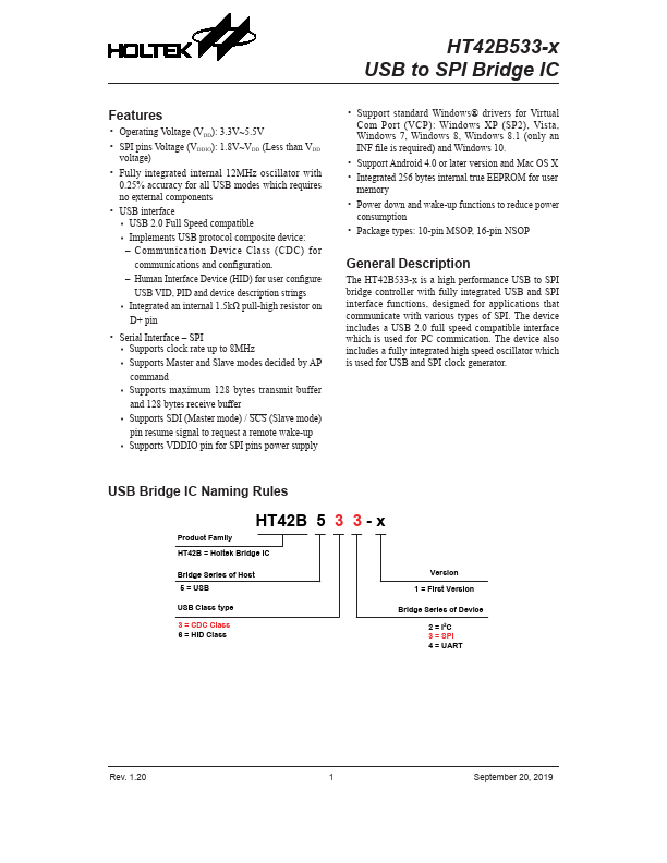 strings ♦♦ Integrated an internal 1.5kΩ pull-high resistor on D+ pin Serial Interface SPI ♦♦ Supports clock rate up to 8MHz ♦♦ Supports Master and Slave modes decided by AP mand ♦♦ Supports maximum 128 bytes transmit buffer and 128 bytes receive buffer ♦♦ Supports SDI (Master mode) / SCS (Slave mode) pin resume signal to request a remote wake-up ♦♦ Supports VDDIO pin for SPI pins power supply Support standard...