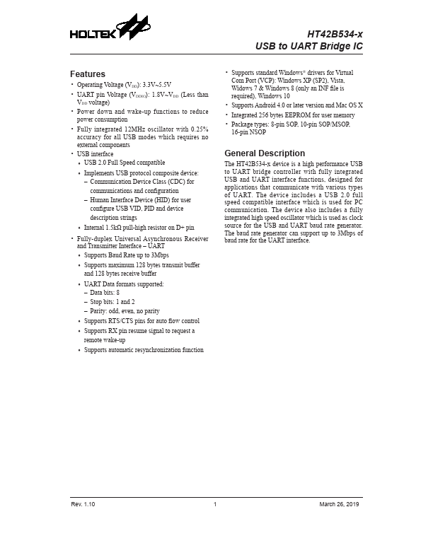 strings ♦♦ Internal 1.5kΩ pull-high resistor on D+ pin Fully-duplex Universal Asynchronous Receiver and Transmitter Interface UART ♦♦ Supports Baud Rate up to 3Mbps ♦♦ Supports maximum 128 bytes transmit buffer and 128 bytes receive buffer ♦♦ UART Data formats supported: odd, even, no parity ♦♦ Supports RTS/CTS pins for auto flow control ♦♦ Supports RX pin resume signal to request a remote wake-up ♦♦ Supports...