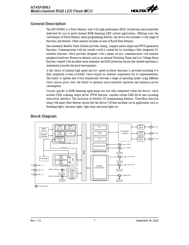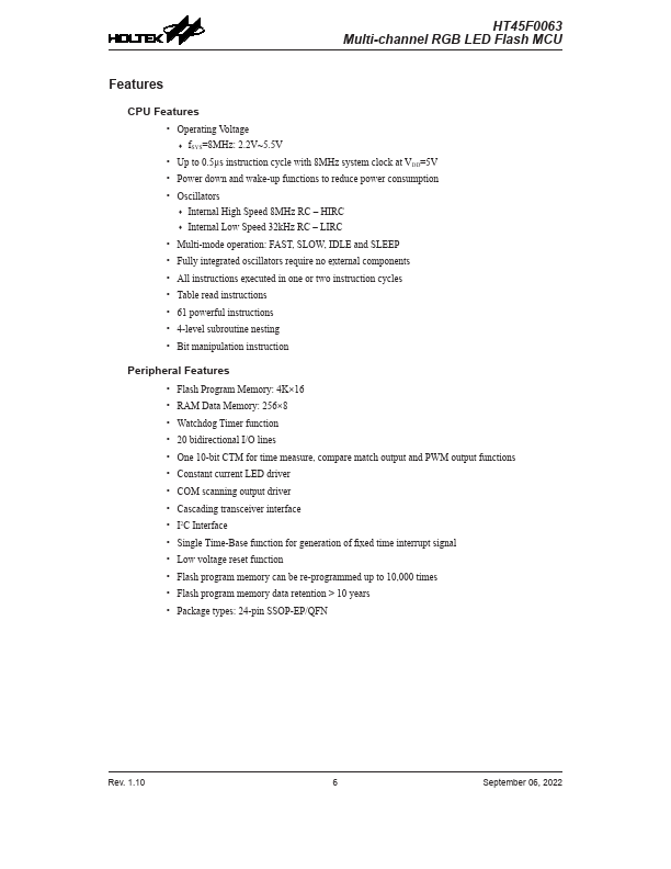 The HT45F0063 is a Flash Memory type 8-bit high performance RISC architecture microcontroller dedicated for use in multi-channel RGB dimming LED control applications. Offering users the convenience of Flash Memory multi-programming.