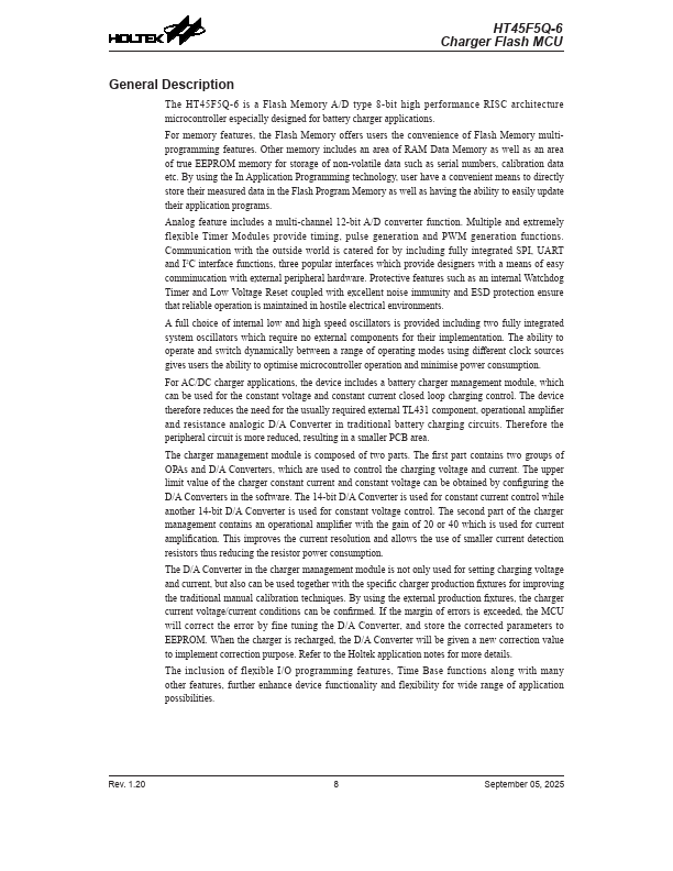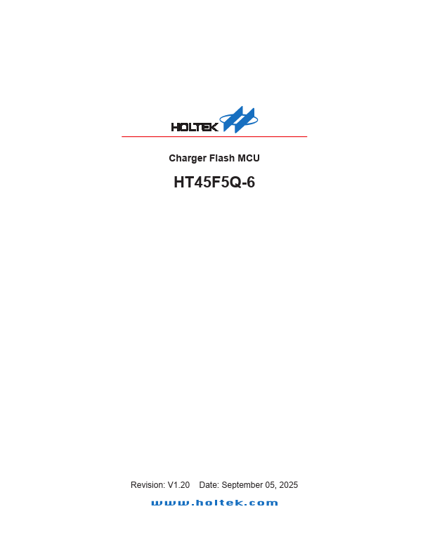 The HT45F5Q-6 is a Flash Memory A/D type 8-bit high performance RISC architecture microcontroller especially designed for battery charger applications.