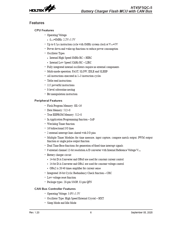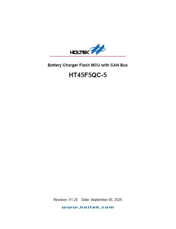 The HT45F5QC-5 is a Flash Memory A/D type 8-bit high performance RISC architecture microcontroller especially designed for battery charger and CAN bus applications.