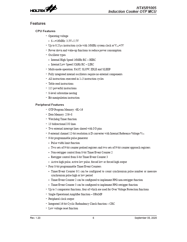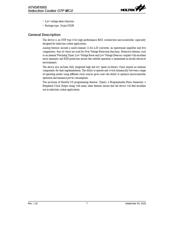 The device is an OTP type 8-bit high performance RISC architecture microcontroller, especially designed for induction cooker applications.