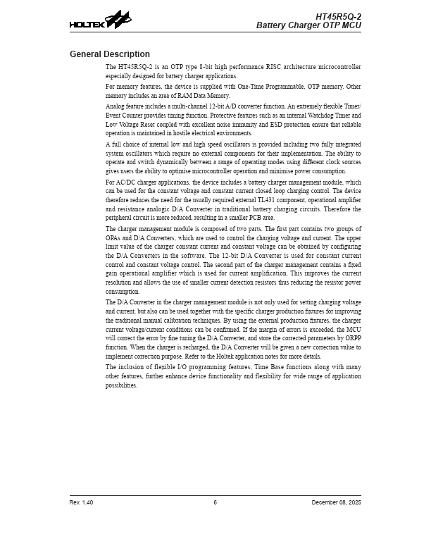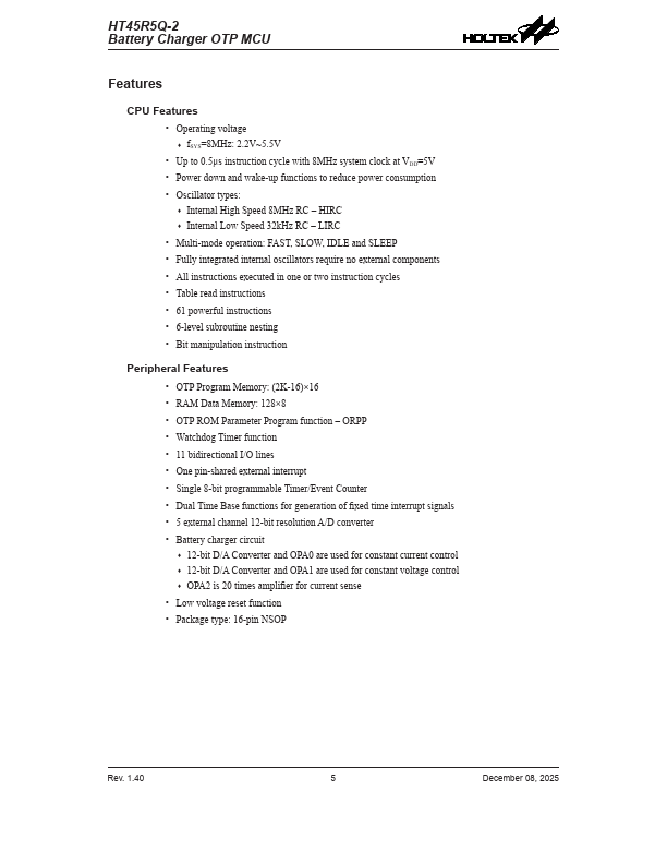 The HT45R5Q-2 is an OTP type 8-bit high performance RISC architecture microcontroller especially designed for battery charger applications.