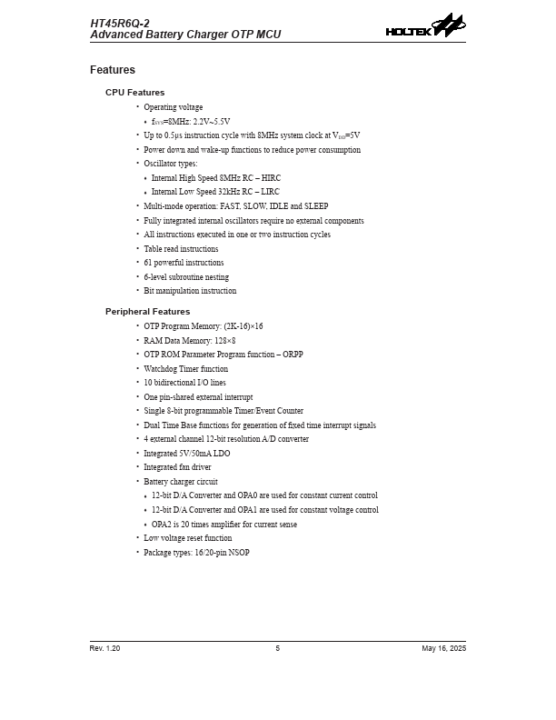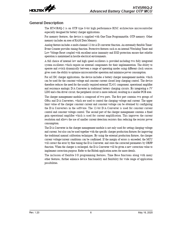 The HT45R6Q-2 is an OTP type 8-bit high performance RISC architecture microcontroller especially designed for battery charger applications.