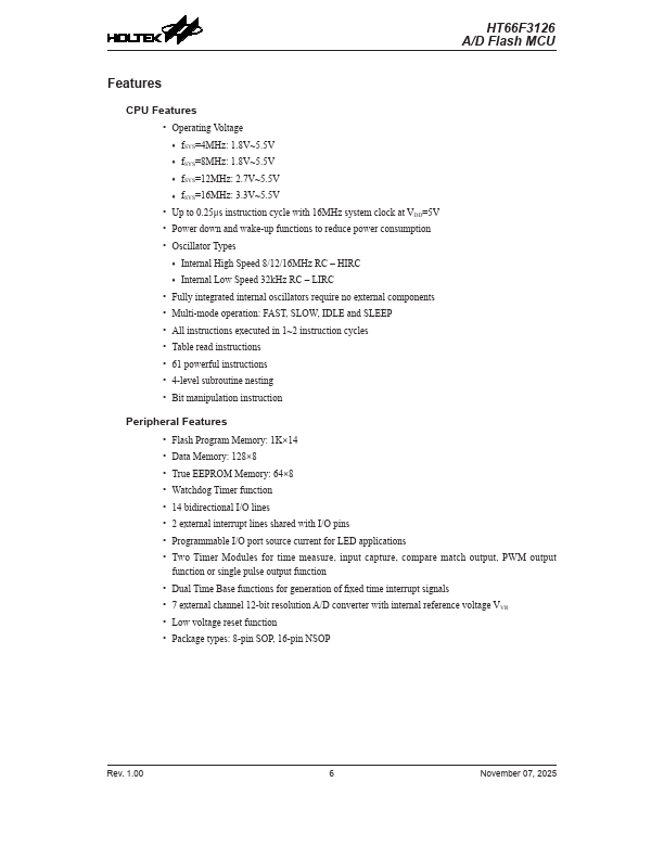 - Up to 0.25μs instruction cycle with 16MHz system clock at VDD=5V