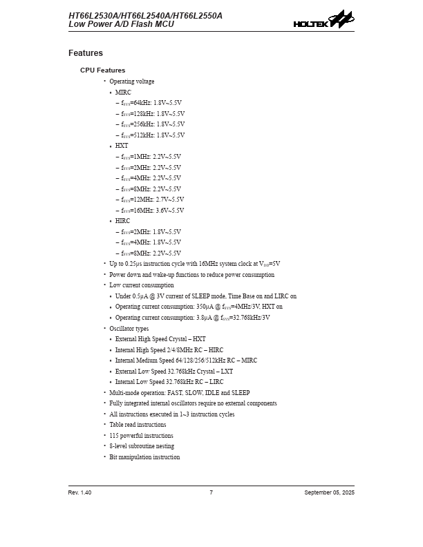 - HIRC ̶ fSYS=2MHz: 1.8V~5.5V ̶ fSYS=4MHz: 1.8V~5.5V ̶ fSYS=8MHz: 2.2V~5.5V