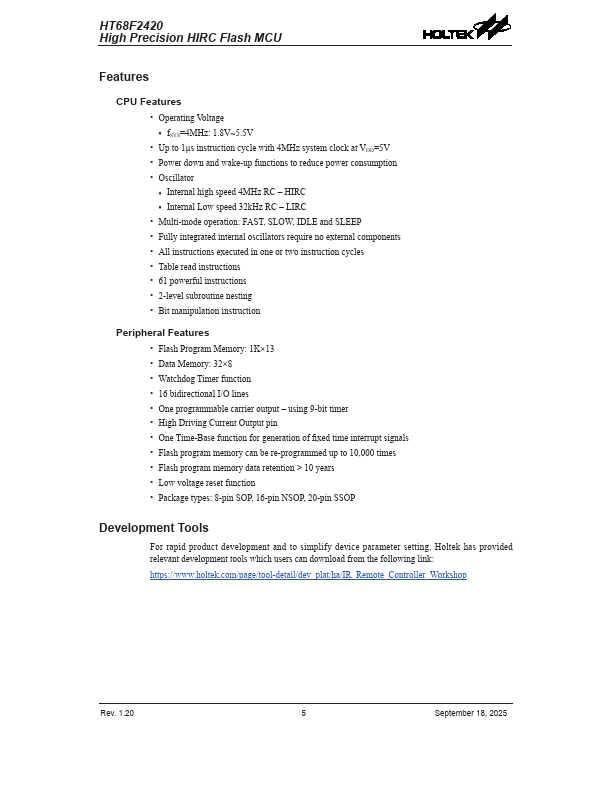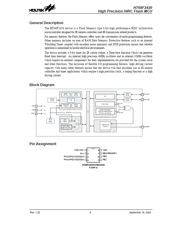 The HT68F2420 device is a Flash Memory type 8-bit high performance RISC architecture microcontroller designed for IR remote controllers and IR transmission related products.