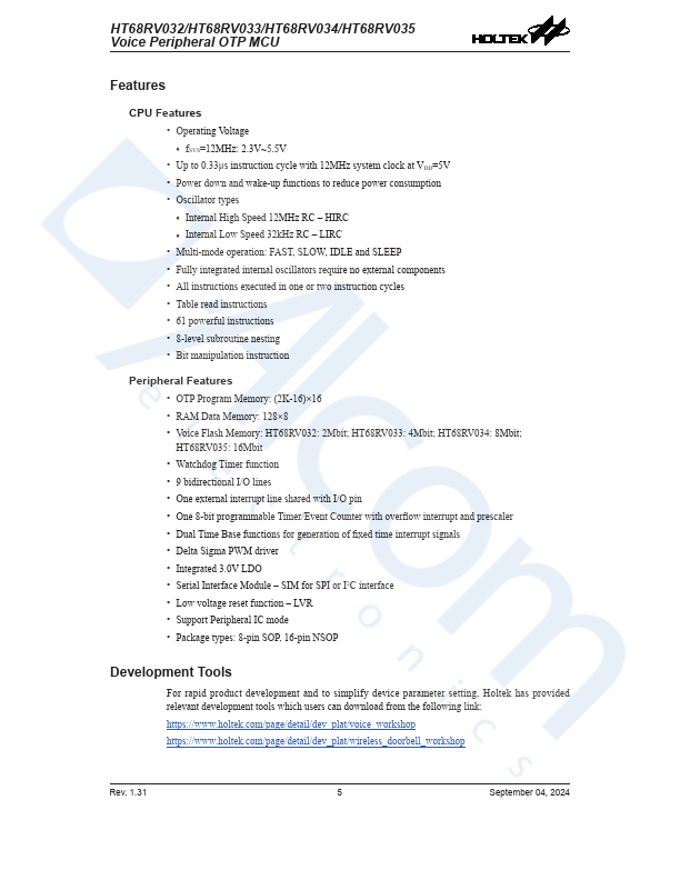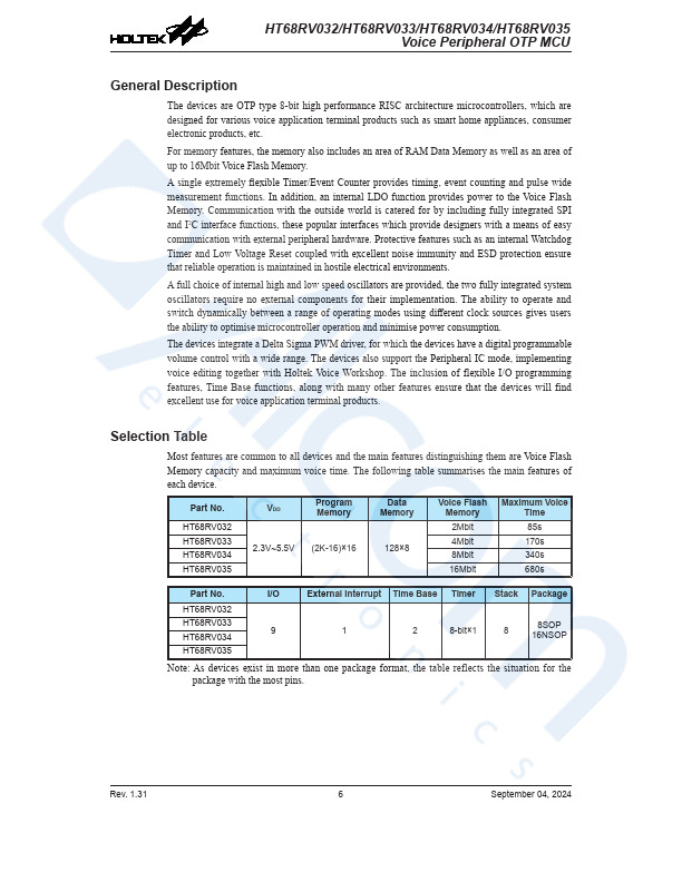 The devices are OTP type 8-bit high performance RISC architecture microcontrollers, which are designed for various voice application terminal products such as smart home appliances, consumer electronic products, etc.