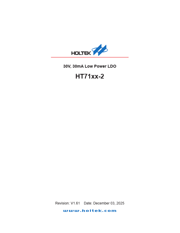 The HT71xx-2 series is a set of three-terminal low power high voltage regulators implemented in CMOS technology. They allow input voltages as high as 30V. They are available with several fixed output voltages ranging from 2.1V to 5.0V. CMOS technology ensures low voltage drop...