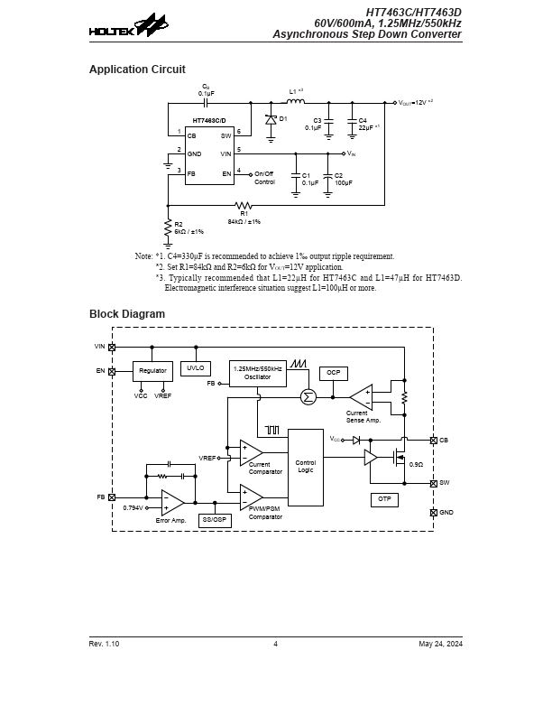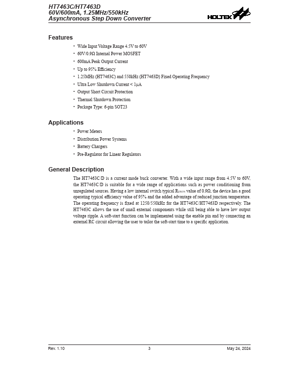 - 1.25MHz (HT7463C) and 550kHz (HT7463D) Fixed Operating Frequency