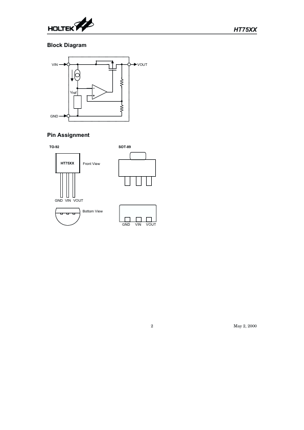 The HT75XX series is a set of three-terminal high current low voltage regulator implemented in CMOS technology. They can deliver 100mA output current and allow an input voltage as high as 24V. They are available with several fixed output voltages ranging from 3.0V to 8V.