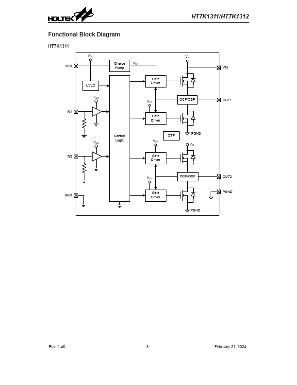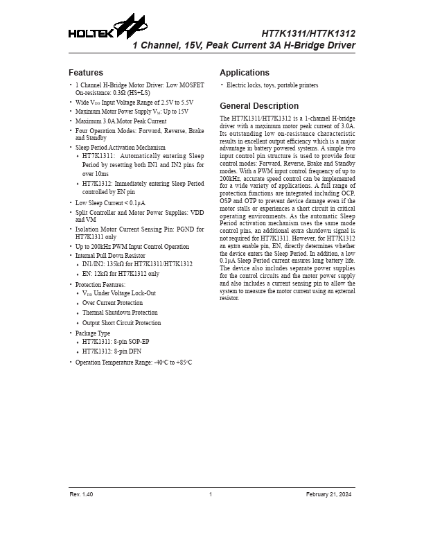 The HT7K1311/HT7K1312 is a 1-channel H-bridge driver with a maximum motor peak current of 3.0A. Its outstanding low on-resistance characteristic results in excellent output efficiency which is a major advantage in battery powered systems. A simple two input control pin structure is used to provide four control modes:.