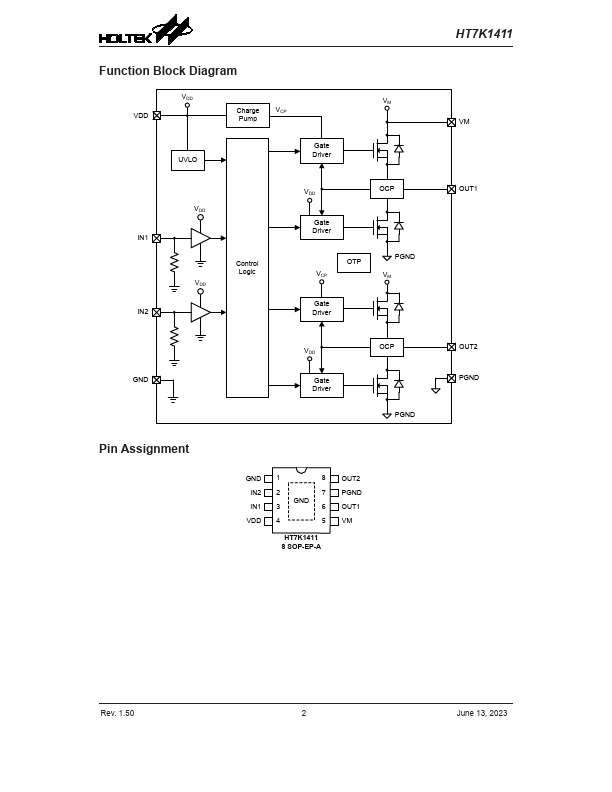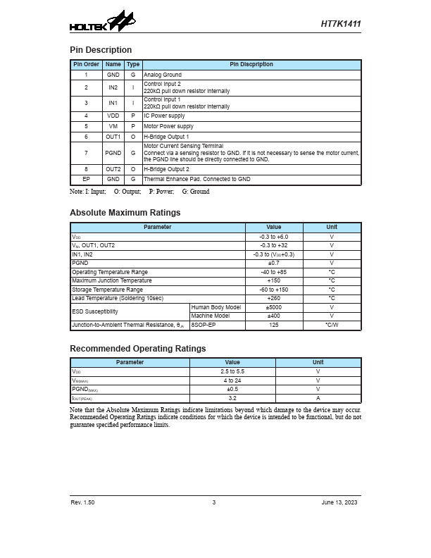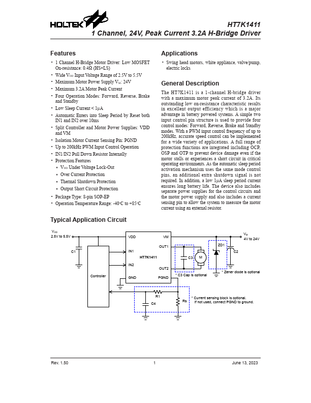 The HT7K1411 is a 1-channel H-bridge driver with a maximum motor peak current of 3.2A. Its outstanding low on-resistance characteristic results in excellent output efficiency which is a major advantage in battery powered systems. A simple two input control pin structure is used to provide four control modes:.