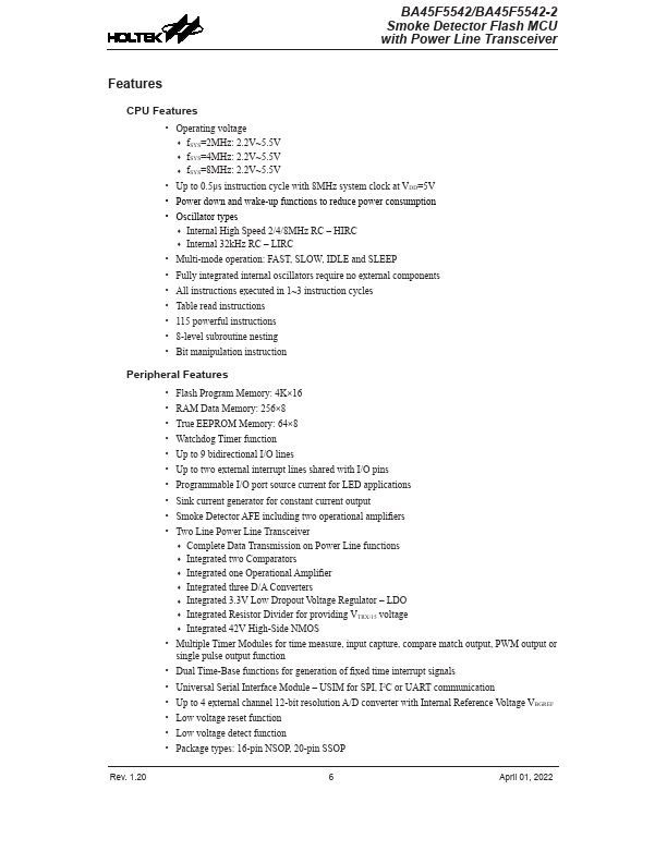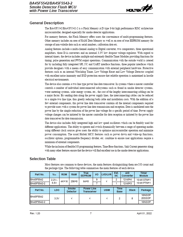 The BA45F5542/BA45F5542-2 is a Flash Memory A/D type 8-bit high performance RISC architecture microcontroller, designed especially for smoke detector applications.