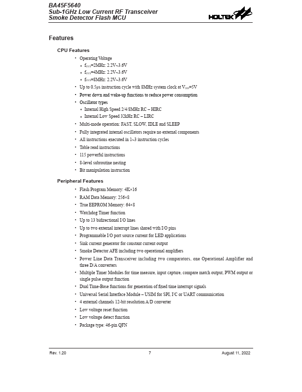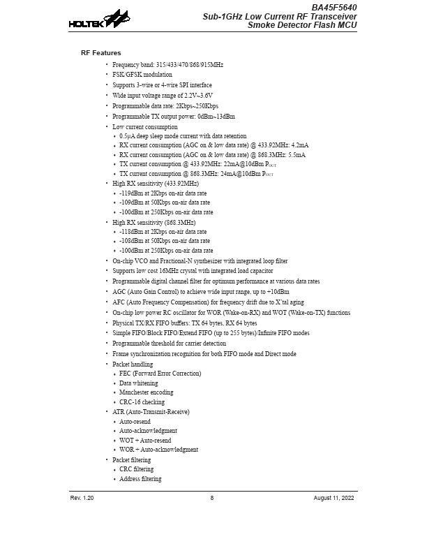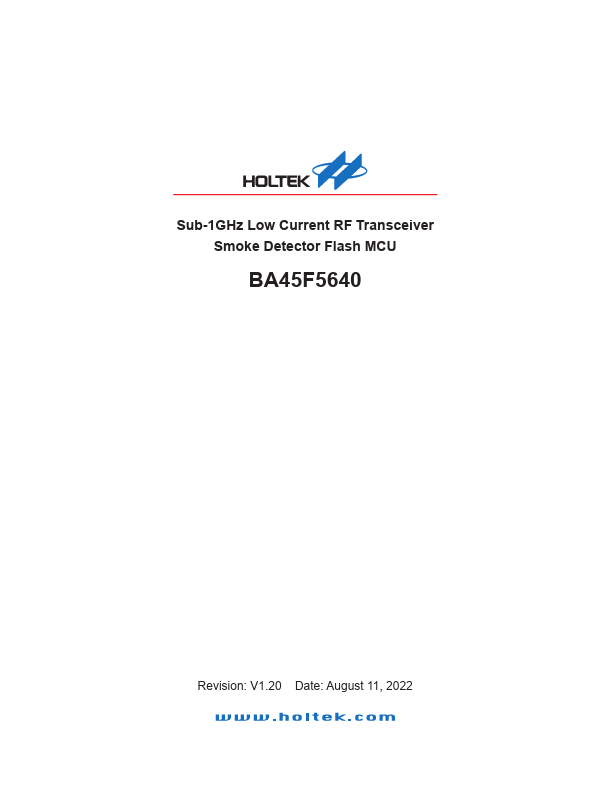 Sub-1GHz Low Current RF Transceiver Smoke Detector Flash MCU BA45F5640 Revision: August 11, 2022 BA45F5640 Sub-1GHz Low Current RF Transceiver Smoke Detector Flash MCU.