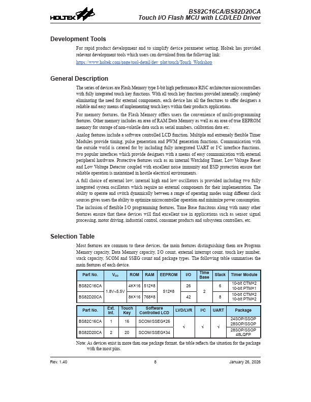 The series of devices are Flash Memory type 8-bit high performance RISC architecture microcontrollers with fully integrated touch key functions. With all touch key functions provided internally, pletely eliminating the need for external ponents, each device has all the feactures to offer designers a reliable and easy means of implementing touch keys within their products applications.