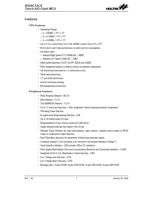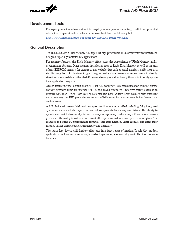 The BS84C12CA is a Flash Memory A/D type 8-bit high performance RISC architecture microcontroller, designed especially for touch key applications.