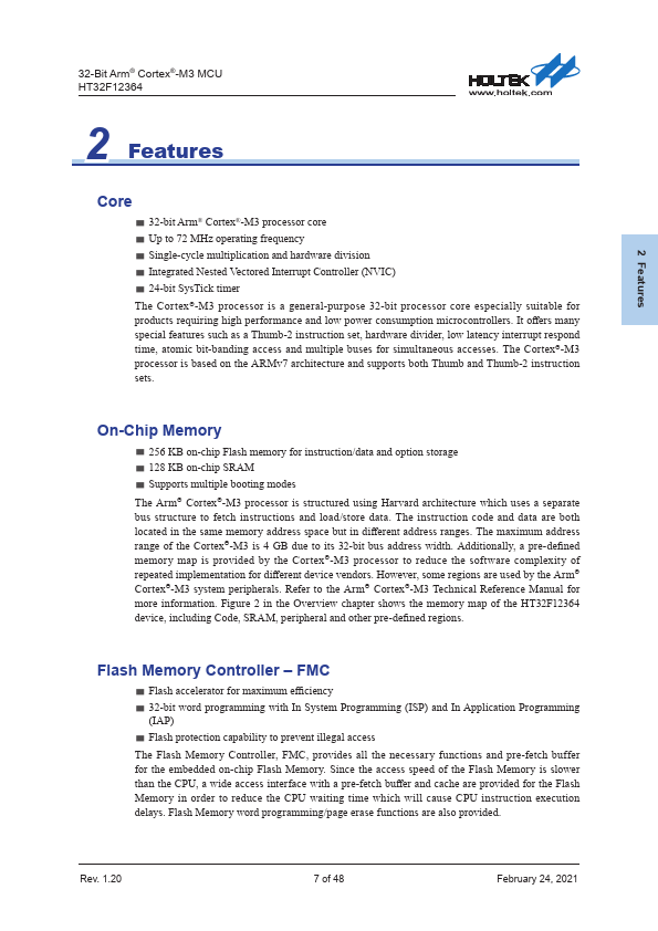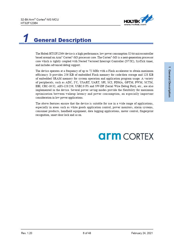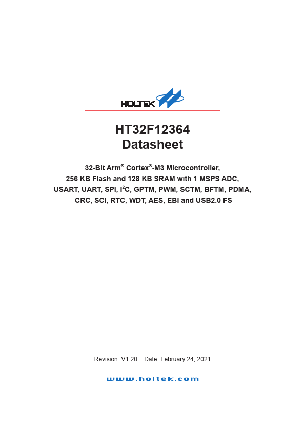 32-Bit Arm® Cortex®-M3 MCU HT32F12364 1 General Description The Holtek HT32F12364 device is a high performance, low power consumption 32-bit microcontroller based around an Arm® Cortex®-M3 processor core. The Cortex®-M3 is a next-generation processor core which is tightly coupled with Nested Vectored Interrupt Controller (NVIC), SysTick timer, and includes advanced debug support. The device operates at a frequency...